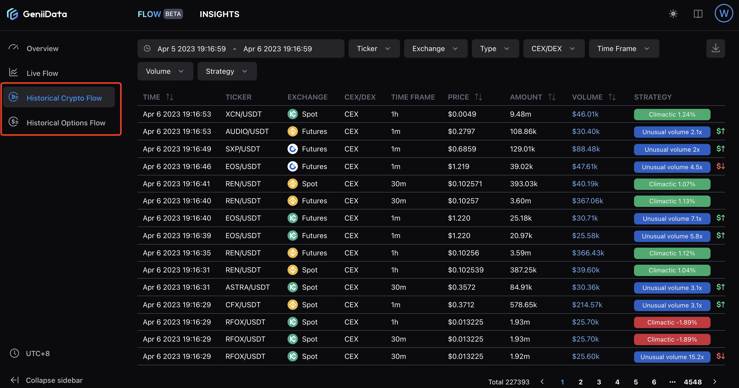 Historical data refers to the complete set of data that has been collected from the live flow. This data is made available for traders to query, validate, and analyze for the purpose of backtesting trading strategies or gaining insights into past market trends. Here, we allow one to get up to 500,000 rows of data in a single download.