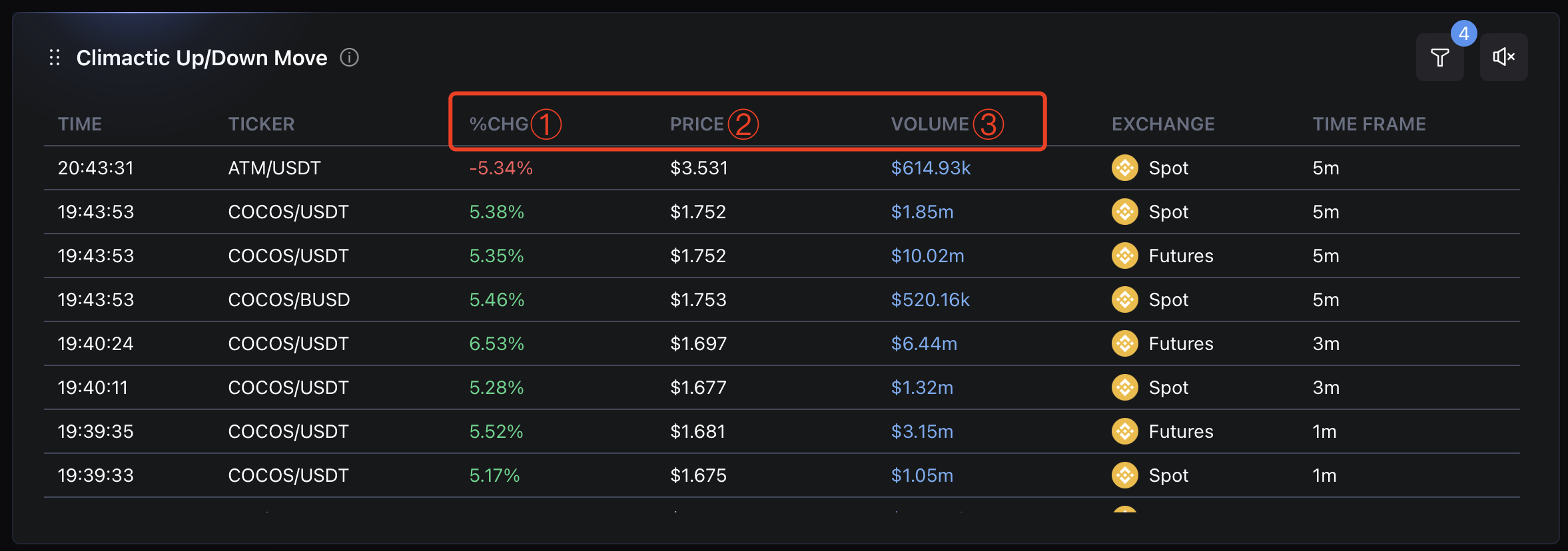 **③Volume**: The cumulative volume of the specific timeframe at the moment of generating the climactic signal.