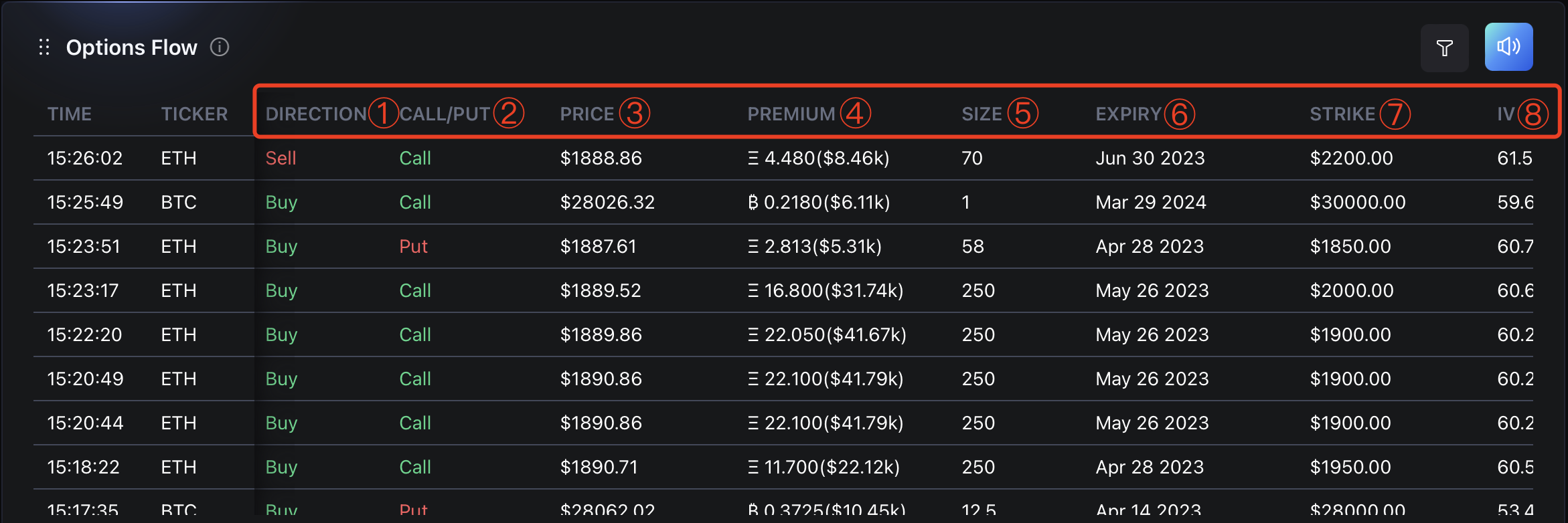 **①DIRECTION:** Refers to the buying or selling of the option. &#x20;
